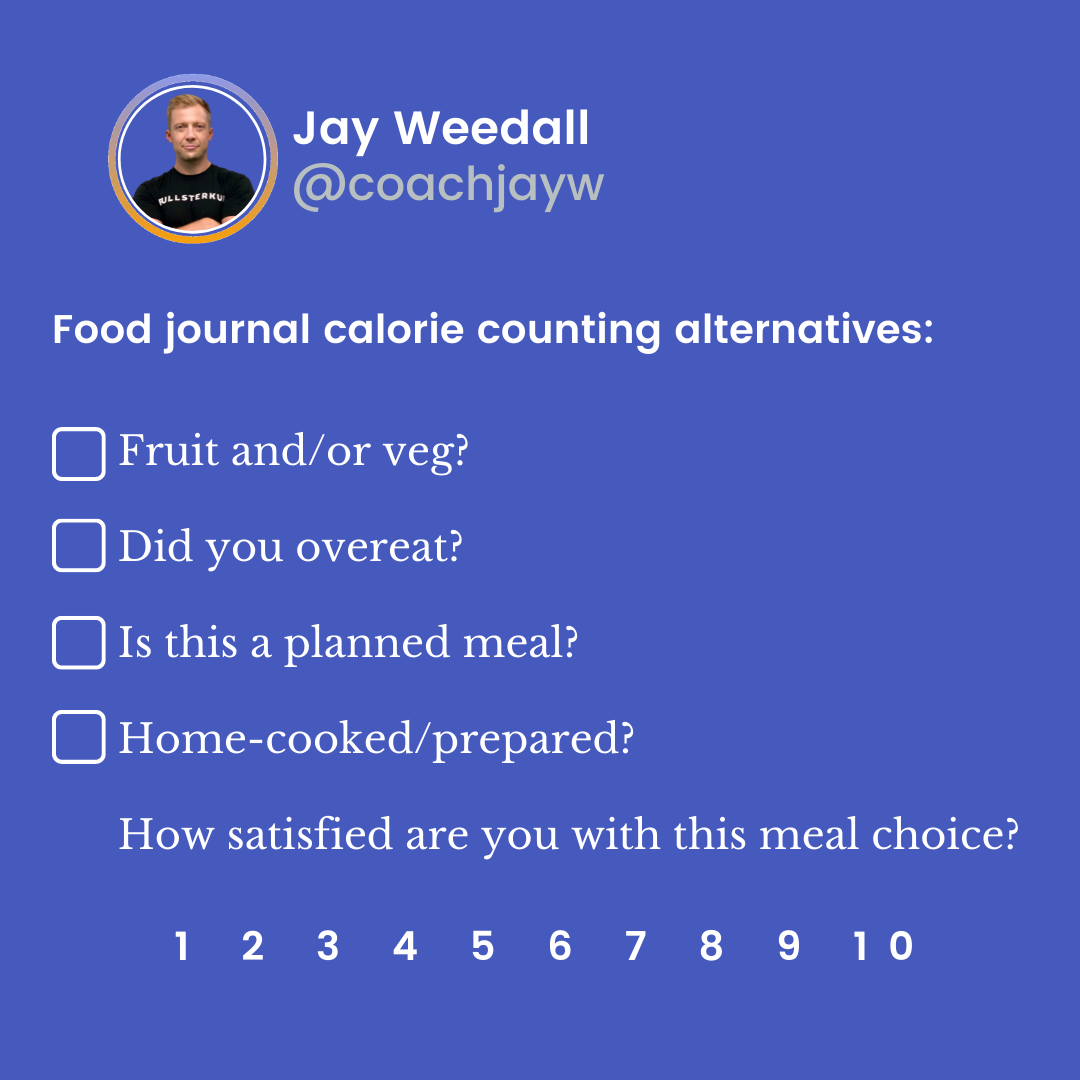 Counting calories is a great strategy providing it works for you. If however, you find calorie counting a high friction task that is time-consuming, hard to maintain, and generally frustrating…then consider tracking processes like the ones in the above checklist rather than outcomes like the weight on the scale or numbers in Myfitnesspal.